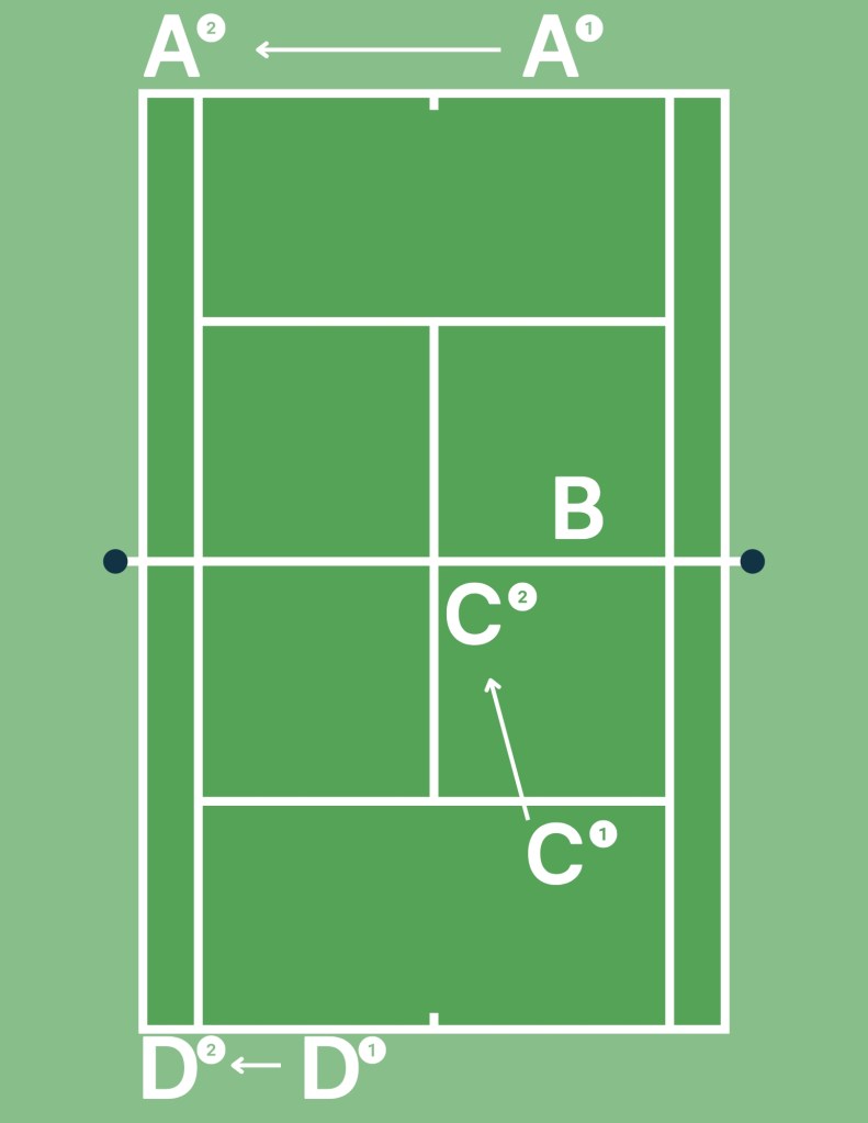 The College Women used this basic formation, and multiple variations of it, to achieve the same goal : To limit the opponent’s best option to a “down the alley” rally—-with our net player in a much better position to attack. And to put pressure on the opposition.